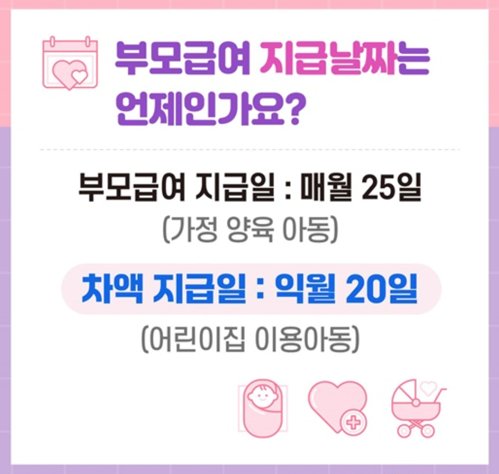가정에서 직접 양육하는 아동의 부모급여는 매월 25일에 정기적으로 지급됐습니다. 일정한 날짜에 반복 지급돼 가계 계획을 세우는 데 도움이 됐습니다. 반면 어린이집을 이용하는 아동에게 지급되는 부모급여 차액은 익월 20일에 지급됐습니다.