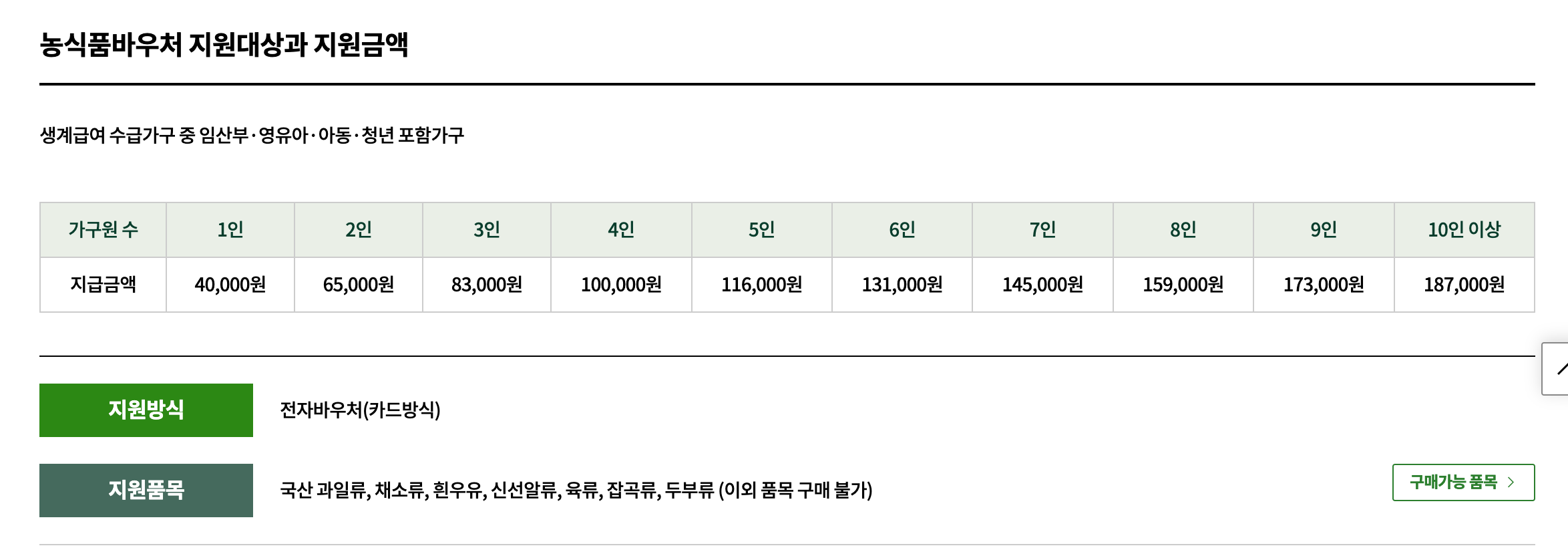 가구원 수에 따라 지원 금액도 차등 적용되며, 1인 가구는 월 4만 원, 2인 가구 6만 5천 원, 3인 가구 8만 3천 원, 4인 가구 10만 원으로 점진적으로 늘어나 10인 이상 가구는 최대 18만 7천 원까지 지원받을 수 있습니다. 이는 가구 규모에 맞춰 실질적인 식품 구매력을 보장하려는 취지입니다.