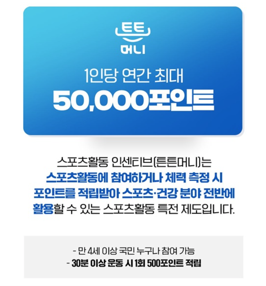 운동을 하면 포인트를 받아 병원·약국 등에서 사용할 수 있는 ‘튼튼머니’ 정책이 시행되고 있습니다. 건강과 가계 절약을 함께 챙길 수 있는 제도입니다.