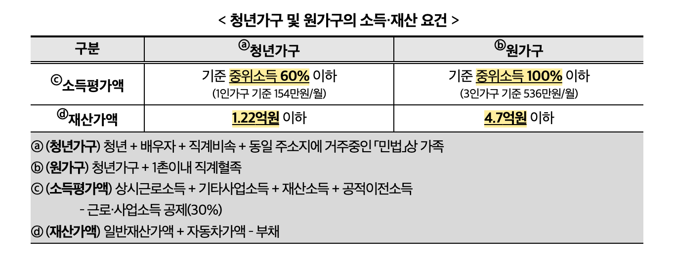 청년 가구의 경우 중위소득 60% 이하 및 재산 1억 2200만 원 이하의 기준을 충족해야 합니다. 또한 부모 가구의 소득은 중위소득 100% 이하, 재산은 4억 7000만 원 이하로 제한됩니다. 이처럼 부모 가구의 경제 상황까지 함께 고려하는 방식은 정책의 형평성을 확보하기 위한 장치로 볼 수 있습니다.