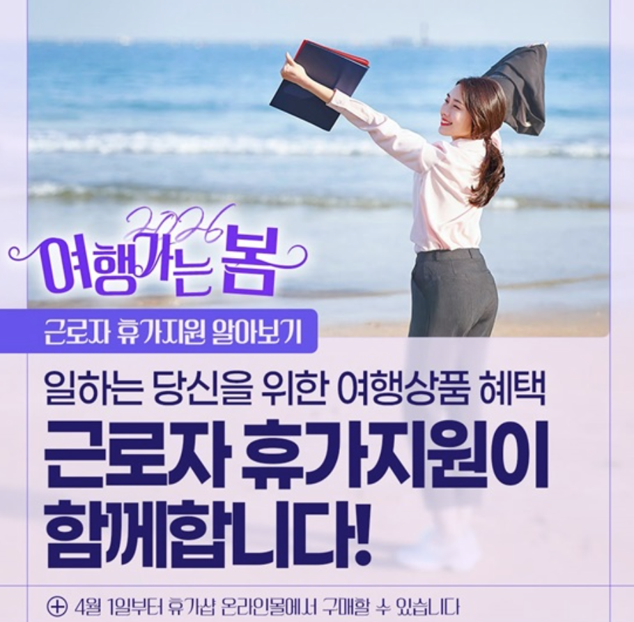 2026년 ‘여행가는 봄’ 기간에는 근로자 휴가지원사업 참여자를 대상으로 특별 할인 혜택이 제공됩니다. 가장 핵심은 휴가샵에서 판매되는 여행상품을 최대 50%까지 할인받을 수 있다는 점입니다.