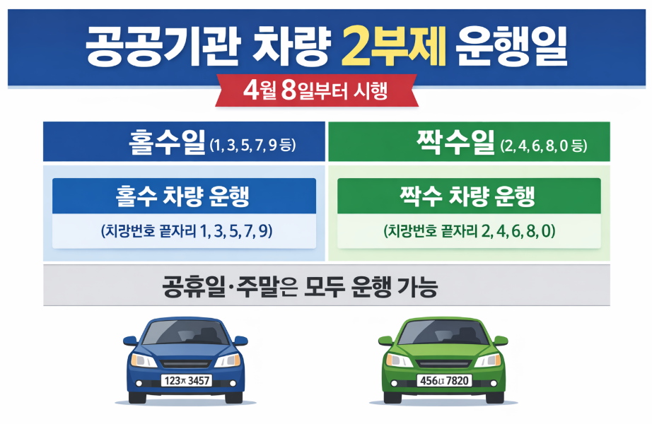가장 큰 변화는 공공기관 승용차 운행이 기존 5부제에서 '2부제(홀짝제)'로 바뀐다는 점입니다. 4월 8일부터는 날짜와 차량 번호 끝자리를 맞춰서 운행해야 합니다.