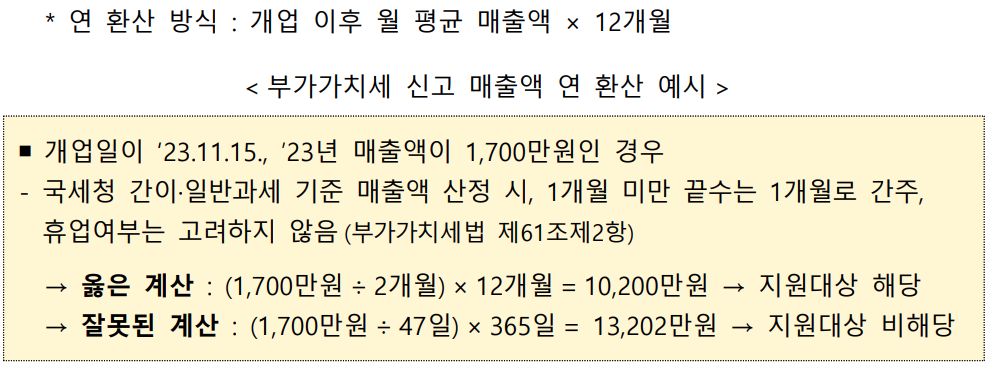 다만, 2022년~2023년 연중 개업한 경우에는 개업 이후 월평균 매출액을 연 환하여 신청 가능합니다.