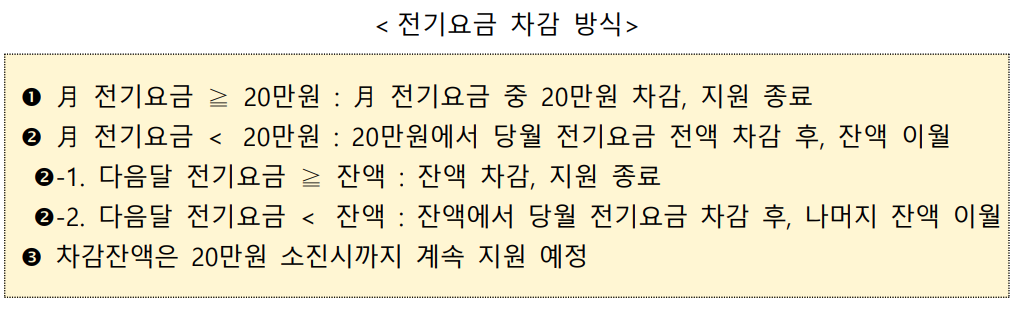 - 지원 방식 : 대상자가 되시면 최초 발행되는 전기요금 고지서상 청구되는 전기요금부터 최대 20만원 차감이 됩니다.