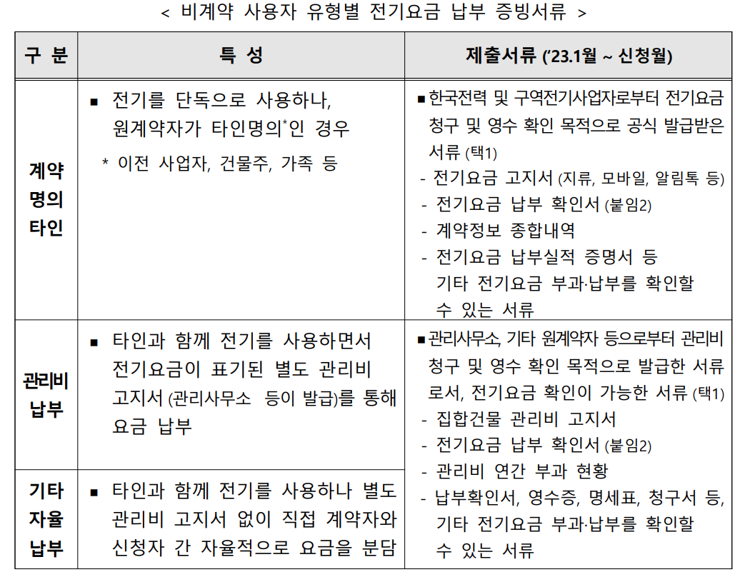 2. 2023년 1월 이후 개업자는 월별 고지서(‘23.1월~신청월)를 합산하여 20만 원 이상이 되는 전기요금 납부 증빙서류를 준비 하시고 20만 원 미만일 경우, ‘23년 1월부터 신청월까지 전기요금 영수증을 준비하시면 됩니다.