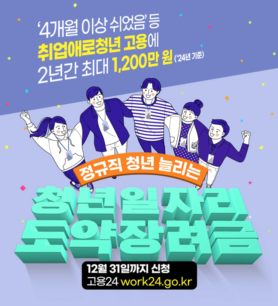 4개월 이상 실업 상태이거나 고졸 이하인 청년 등 취업에 어려움 겪는 15~34세 청년을 고용하면 사업주에게 인건비를 지원하는 사업으로 만 15세~ 만 34세 이하 청년을 정규직으로 채용하고 6개월 이상 고용을 유지하면 올해 기준으로, 청년 1명당 1년간 월 60만원씩 최대 720만 원을, 2년 근속하면 추가로 480만 원을 지원해 총 1,200만 원의 인건비 부담을 덜어드려요.