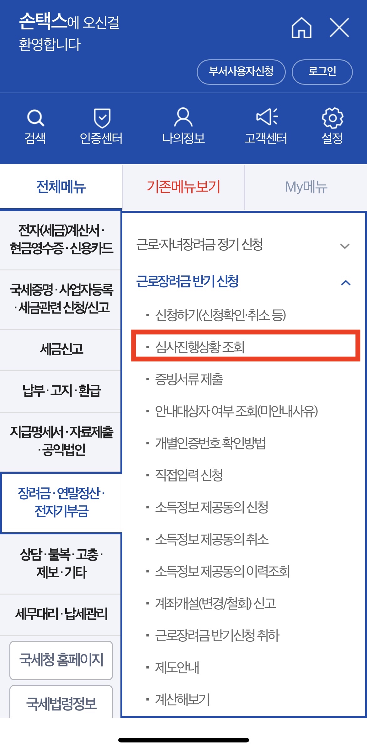 모바일 손택스 앱 실행 → 메뉴 장려금·연말정산·전자기부금 → 근로장려금 반기신청 → 심사 진행상황조회