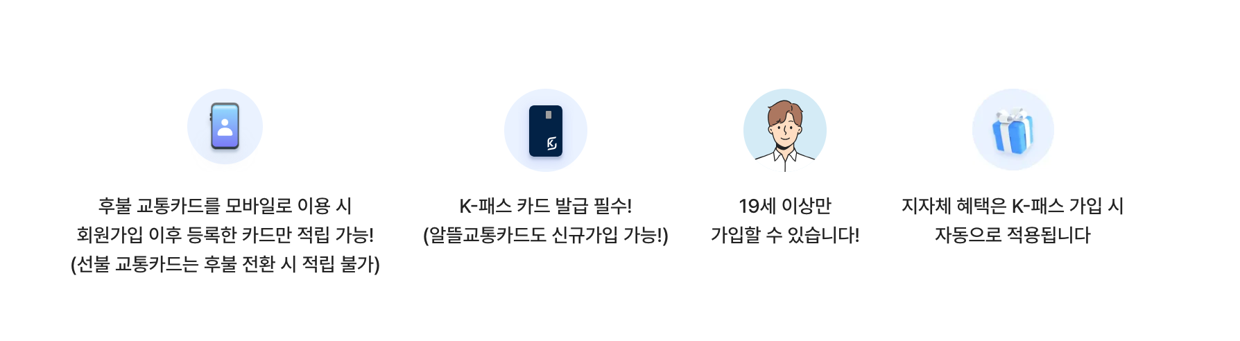 K-패스 카드 발급 (알뜰교통카드도 회원가입이 가능합니다.) ▶︎ K-패스 회원가입 ▶︎ K-패스 교통카드로 전국 대중교통 이용 시 이용금액의 일정 비율을 적립 및 지급