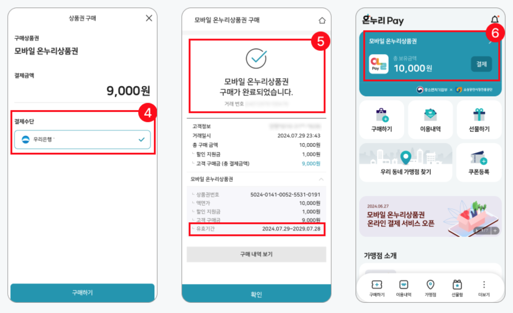 3. 충전 및 사용 : 계좌 등록 후 잔액을 충전하고, 지정된 장소에서 상품권을 사용합니다.