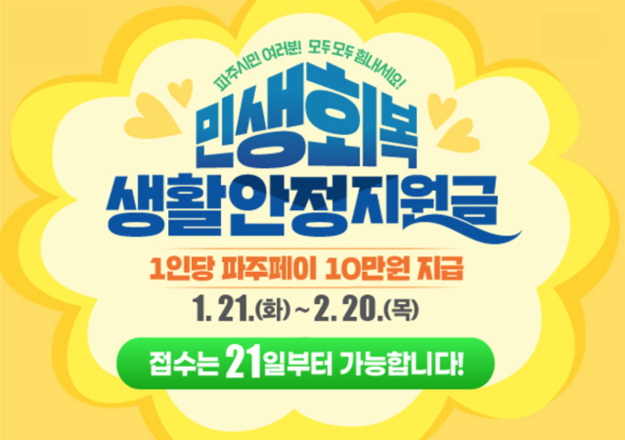 파주시는 오는 1월 21일부터 2월 20일까지 한 달간 '민생 회복 생활 안정지원금' 신청을 받습니다. 이번 지원금은 지난해 12월 26일 기준으로 파주시에 주민등록이 돼 있는 내국인 주민을 대상으로 하며, 1인당 10만 원씩 지역화폐인 파주페이로 지급됩니다. 지급된 지원금은 다음 날 오후부터 즉시 사용할 수 있습니다.