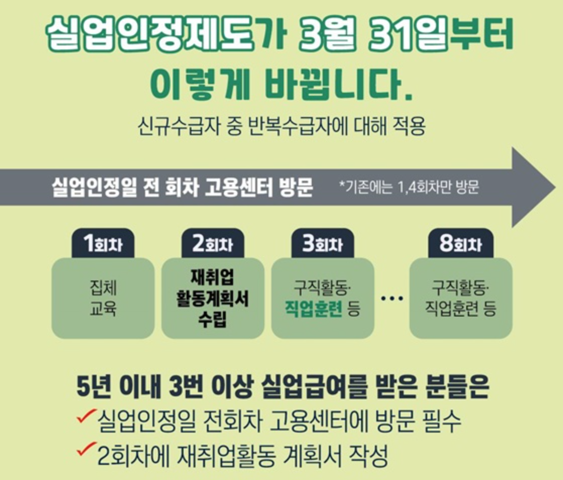 기존 실업인정제도에서는 수급자가 1차와 4차 실업인정일에만 고용센터를 방문하면 되었습니다. 그러나 2025년부터는 반복 수급자에 한해 모든 실업인정일에 고용센터 방문이 필수적으로 변경되었습니다. 이 조치는 실업급여를 반복적으로 수급하는 사례를 줄이고, 구직자의 실질적인 취업을 지원하기 위한 것입니다.