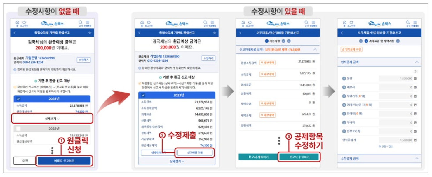 기존의 환급 신청 절차는 비교적 복잡하여 납세자가 직접 서류를 제출하거나 추가 절차를 수행해야 했습니다. 하지만 원클릭 환급 서비스를 이용하면 한 번의 클릭만으로 신청이 완료되며, 국세청과 연계되어 자동으로 환급이 진행됩니다.
